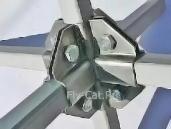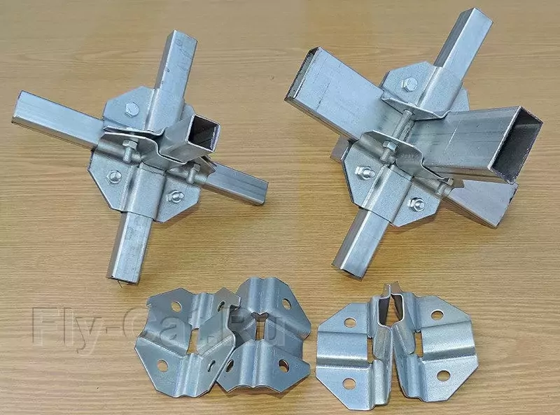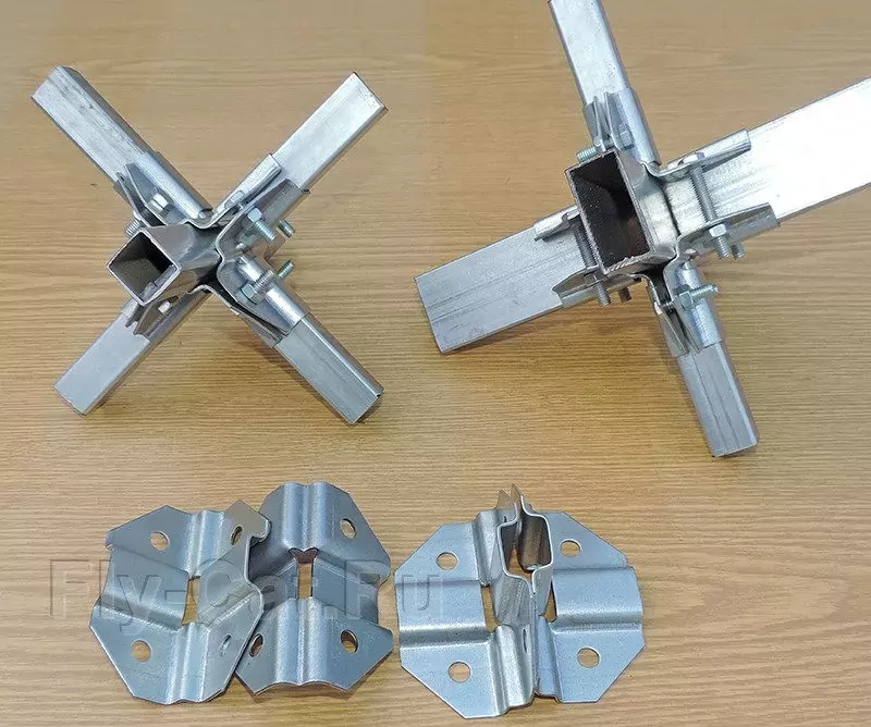 Краб-система крепежа угол на 6 сторон состоит из 4 деталей, для соединения которых используются болты и гайки. Форма этого крепления даёт возможность надежно обхватить профильную трубу с каждой стороны.