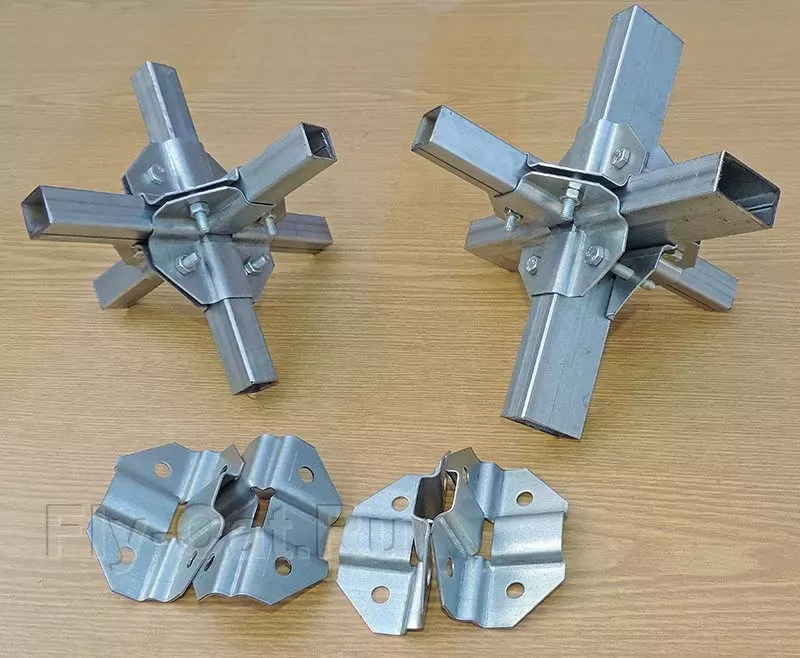 Каждая полка крепежа имеет 6 размеров 20х20х20х20х20х20. Тощина 1.5 мм цинк или 2 мм без покрытия, отверстия под болт М8. Таким крепежём возможно соединить профильную трубу 20х20. Так же возможна комбинация соединения труб разного сечения: 20х20 + 20х40; 20х20 + 20х30 (смотрите фото ниже)