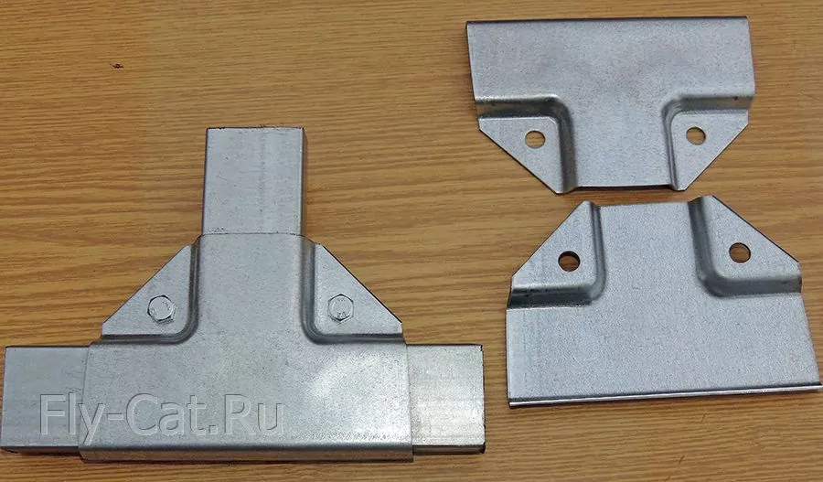 Универсальное крепление состоит из двух половинок, для соединения которых используются болты и гайки. Форма этого крепления даёт возможность надежно обхватить трубы одинакого сечения. Полка крепежа имеет 3 размера 40х40х40. Толщина оцинкованного металла 1.5 мм. Таким крепежом можно соединить трубы с одинаковым сечением. Трубы с разным сечением, этим крепежом соединить нельзя.