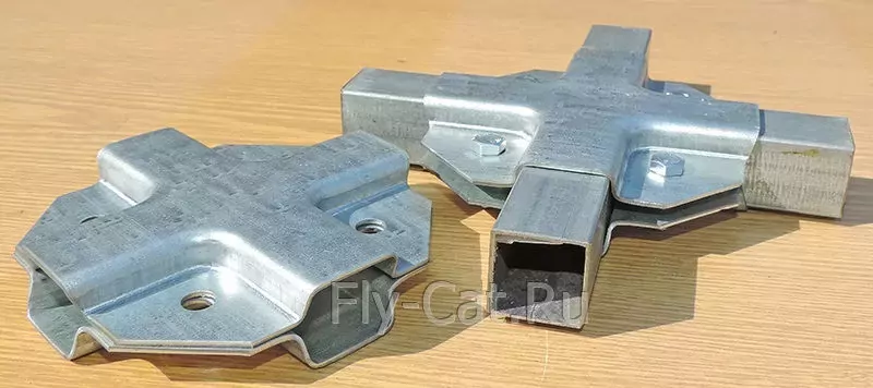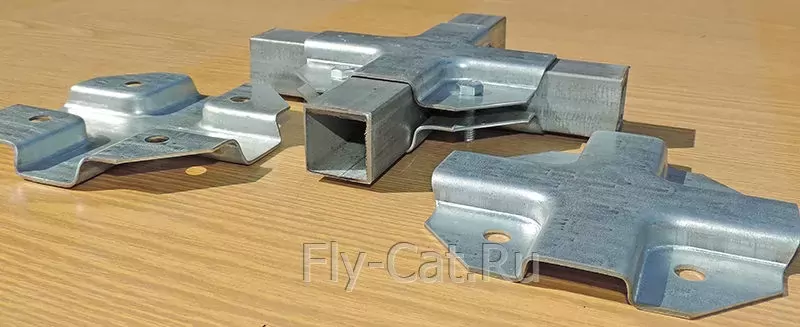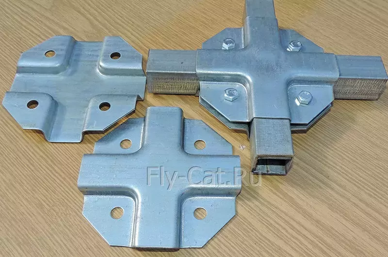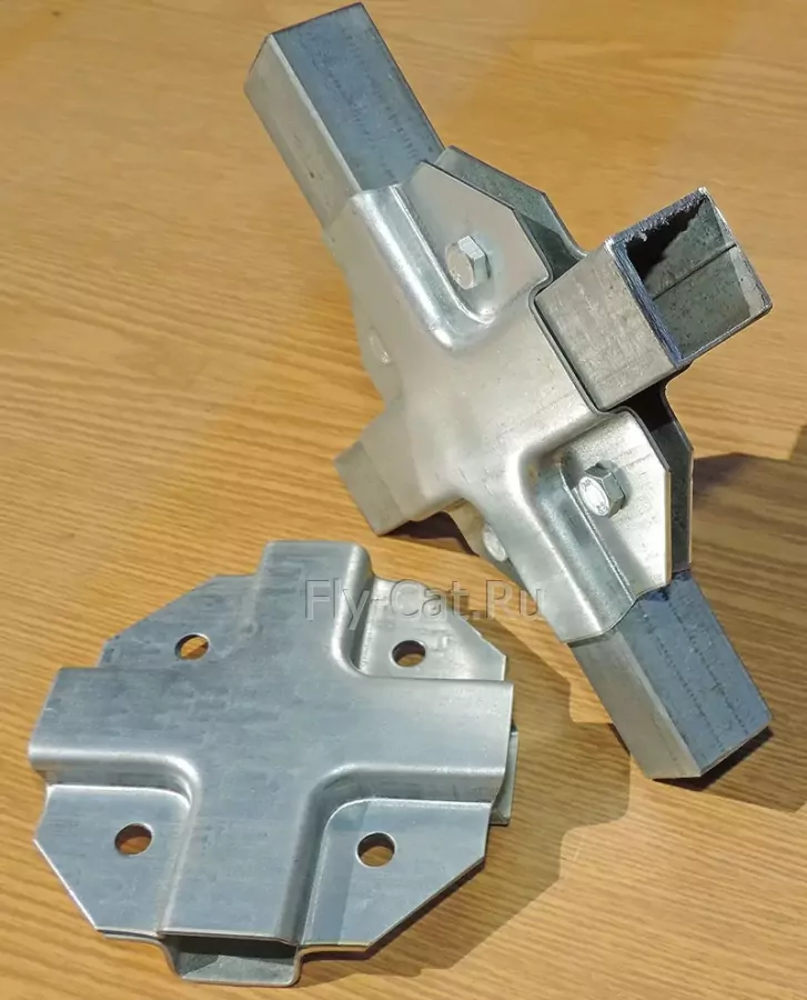 Универсальное крепление состоит из двух половинок, для соединения которых используются болты и гайки. Форма этого крепления даёт возможность надежно обхватить профильную трубу с каждой стороны. Полка крепежа имеет 4 размера 25х25х25x25. Толщина оцинкованного металла 1.2 мм цинк, отверстия бод болт М6 или толщиной 1,5 мм цинк с отверстиями под болт М8. Таким крепежом можно соединить трубы одинакового сечения размером 25х25 мм.