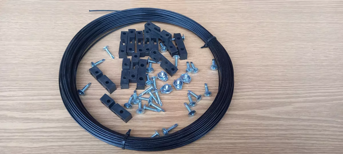 Комплект на 6-и метровую теплицу - вы получите 13 м. пластиковой проволоки; 14 шт специального крепления для агрошпалеры; 4 зажима для троса. Цена комплекта 500 руб