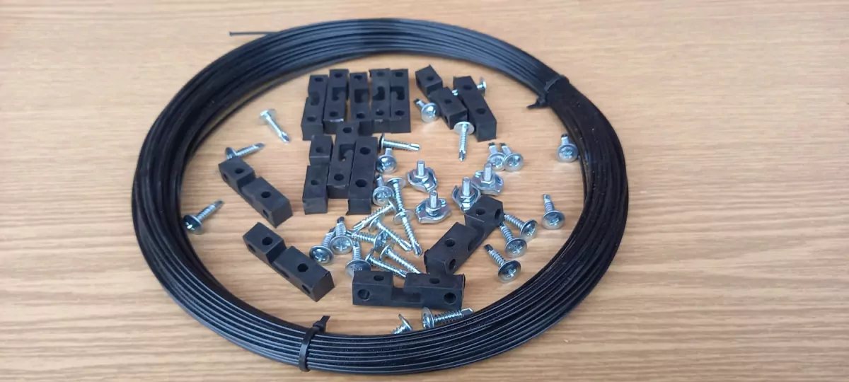 Комплект на 4-х метровую теплицу - вы получите 9 м. пластиковой проволоки; 10 шт специального крепления для агрошпалеры; 4 зажима для троса. Цена комплекта 400 руб
