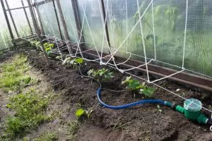 1. Капельная линия со встроенными через 30 см цилиндрическими капельницами и расходом воды 3л/ч, см. здесь. Длинна капельного шланга составляет 25 метров, этого хватит на три линии (грядки) в 6-ти метровой теплице