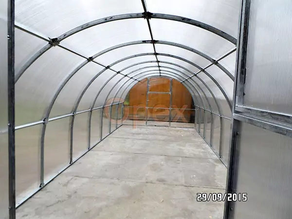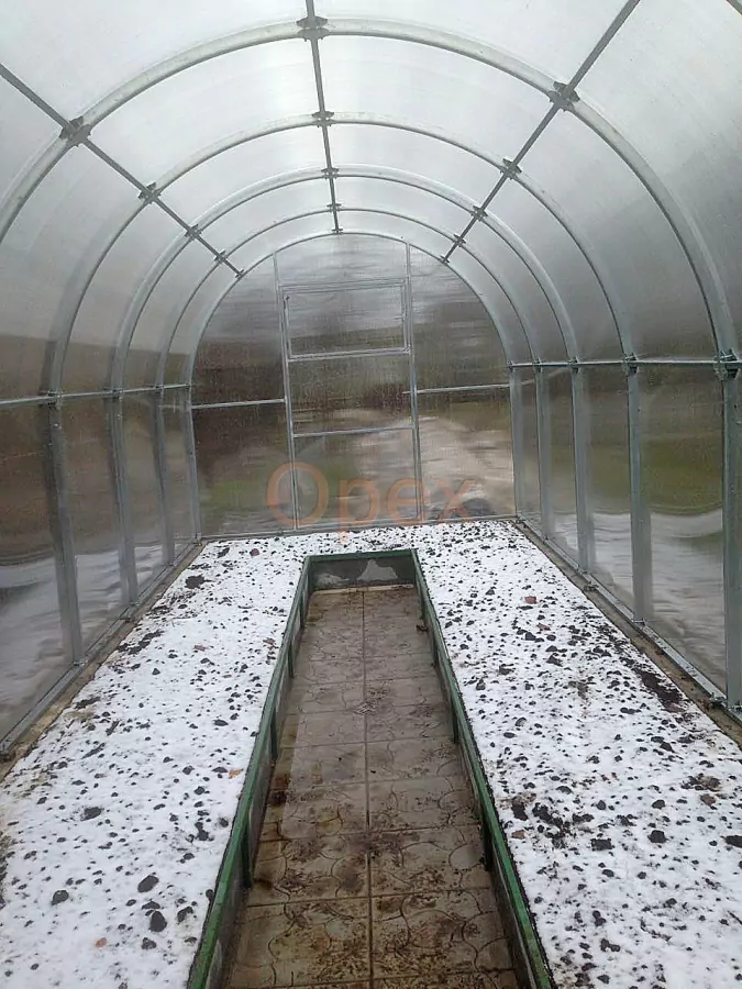 Данные модели теплицы способна выдерживать без особых проблем снеговую нагрузку более 250 кг на квадратный метр покрытия. Для увеличения несущей способности каркаса, арки соединены между собой от 5-ти и до 9-ти металлическими стяжками. Очень важно - благодаря краб системе крепежа, дуги находятся в одной плоскости с перемычками, а значит поликарбонат не будет провисать под тяжестью снега.