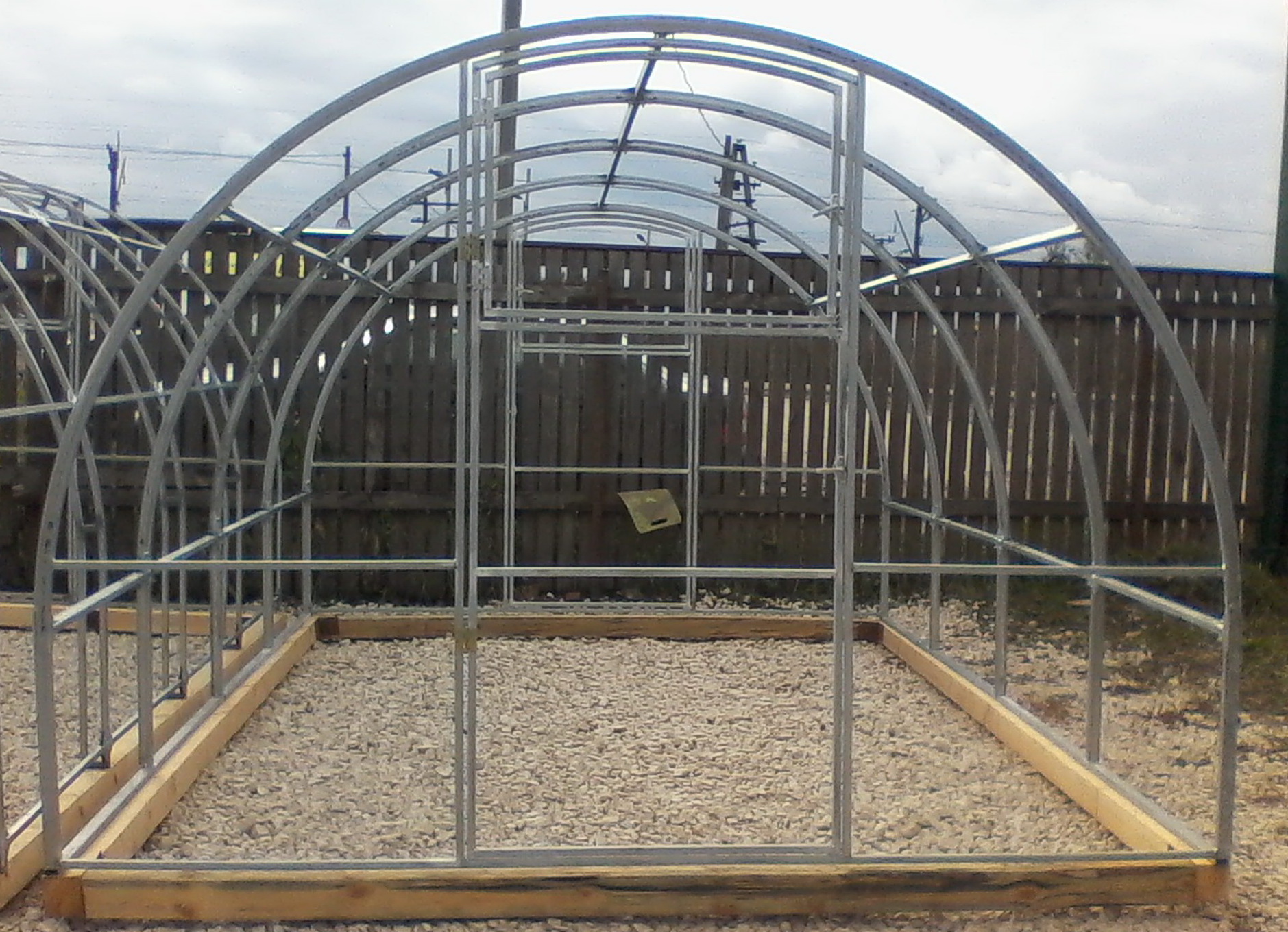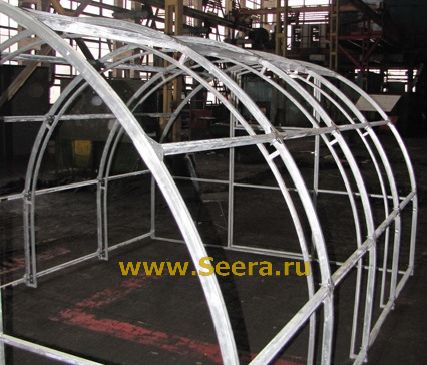 Арки отдалены друг от друга на 1 метр, высота 2,50 м, ширина 2,7 м, 6 стяжки + две по основанию и конёк на крышу.